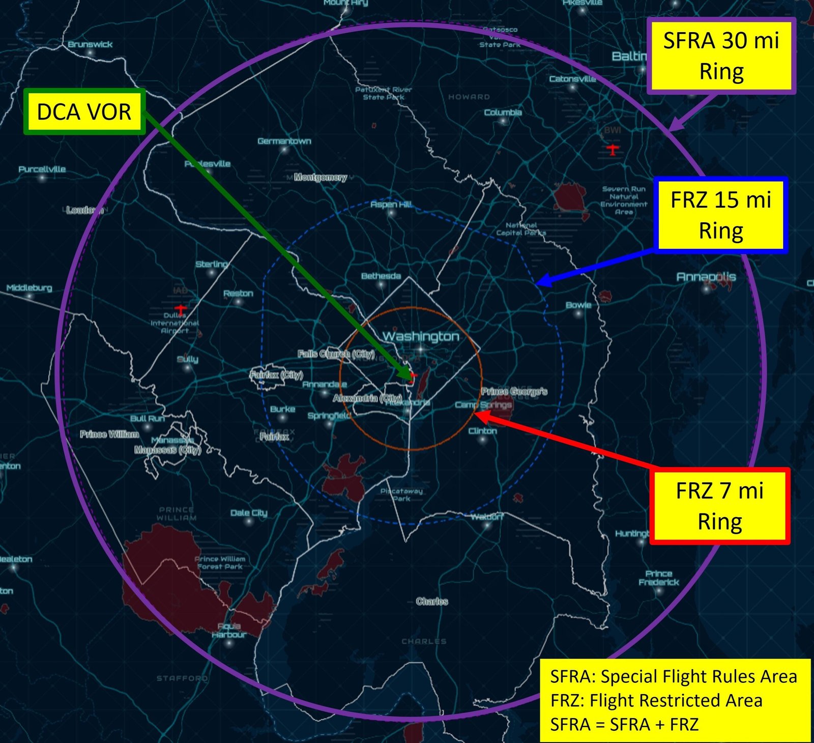 The DC FRZ is based on distances from DC Reagan Intl airport (DCA) as shown in the picture below. Drone operations within the 7 mile (RED) ring cannot be performed (unless supporting a government agency). Operations between 7 miles and 15 miles (DOTTED DARK BLUE) can be done by me but require FAA/TSA approval. Operations between the 15 mile and 30 mile (PURPLE) ring can be done both day and night without the need for added approvals.